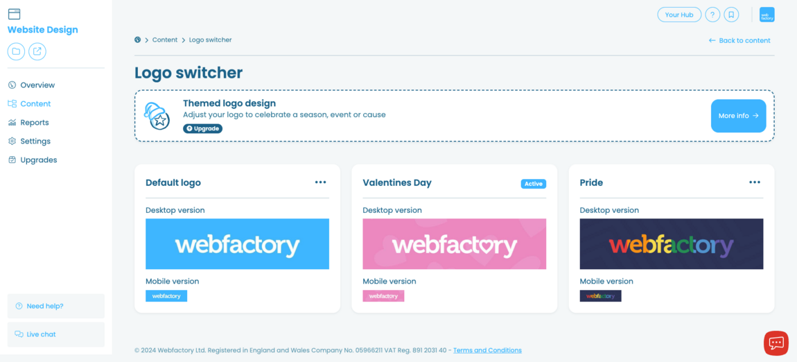 In the website editor you can purchase additional versions of your logo themed to a season, event or cause. Once the logo theme has been completed you can switch between it and any other variants you have in the logo switcher section.