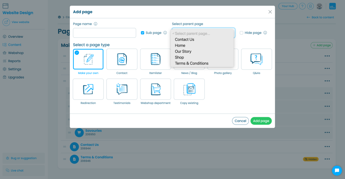 - Select your desired 'Page type' (e.g. Make your own, Contact, News/Blog, etc.).