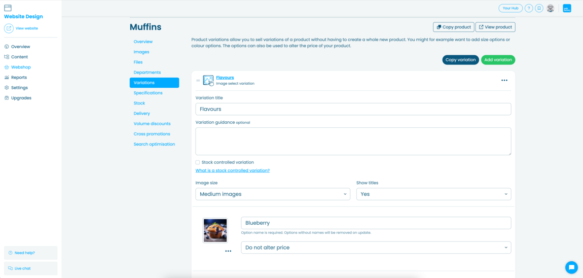 - Name your variation options and upload your image. In this example we'll call our options 'Blueberry', 'White chocolate' and 'Caramel' and upload an image for each.