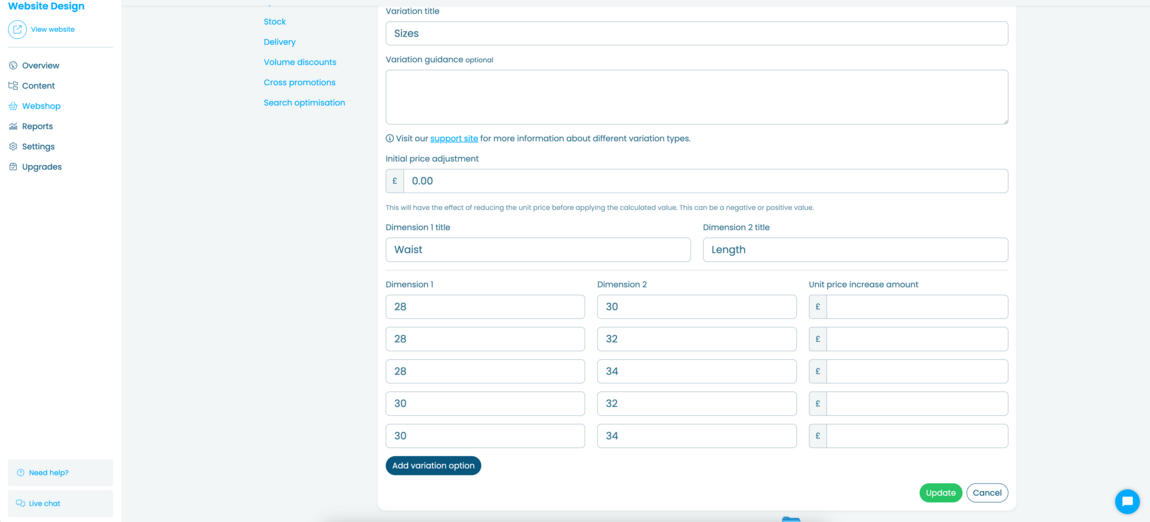 Imagine you sell different sizes of classic jeans. You wish to create a variation as part of your main product called 'Sizes'.
